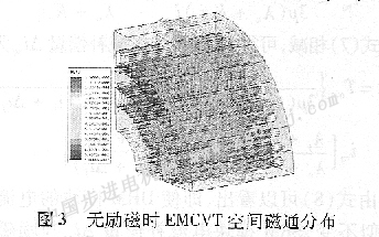此時EMCVT的空載氣隙磁場只由永磁體產(chǎn)生。圖3是EMCVT 1/4結(jié)構(gòu)的空間磁通分布圖。