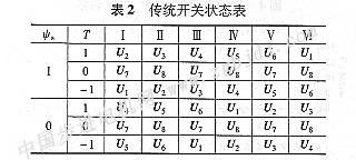由式(2)可知,在直接轉(zhuǎn)矩控制系統(tǒng)中,電磁轉(zhuǎn)矩的增減變化是由定子磁鏈幅值與磁通角兩者的增減變化決定的(轉(zhuǎn)子磁鏈以同步角速度沿圓形軌跡旋轉(zhuǎn),其幅值由負(fù)載決定),通過上述分析知道,任何一個(gè)電壓矢量都同時(shí)引起定子磁鏈幅值和磁通角產(chǎn)生變化,兩者變化的趨勢決定了電磁轉(zhuǎn)矩的變化趨勢。尤其當(dāng)兩者變化相矛盾時(shí),變化快的一個(gè)則起主要作用。目前直接轉(zhuǎn)矩控制大都采用bang-bang控制,即磁鏈控制器采取兩點(diǎn)式滯環(huán)比較器,轉(zhuǎn)矩控制器采取三點(diǎn)式滯環(huán)比較器,傳統(tǒng)開關(guān)狀態(tài)表如表2所示。