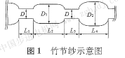 在紡紗過程中通過改變瞬時(shí)牽伸倍數(shù)或增加附加纖維,使在紗線長(zhǎng)度方向上產(chǎn)生符合一定要求的粗節(jié)的紗線稱為竹節(jié)紗,其中所產(chǎn)生的粗節(jié)稱為竹節(jié),兩粗節(jié)之間的紗線稱為基紗。如圖l所示,L1L3為基紗節(jié)長(zhǎng),L2、L4為竹節(jié)節(jié)長(zhǎng),D為基紗直徑,D1、D2為竹節(jié)直徑。目前一般采用變牽伸倍數(shù)的方法生產(chǎn)竹節(jié)紗,用伺服電動(dòng)機(jī)單獨(dú)驅(qū)動(dòng)中、后羅拉,改變中、后羅拉與前羅拉的轉(zhuǎn)速比就能改變紗線的牽伸倍數(shù)即紗線的粗細(xì),控制伺服電動(dòng)機(jī)轉(zhuǎn)過的角度即可控制紗線的長(zhǎng)度。