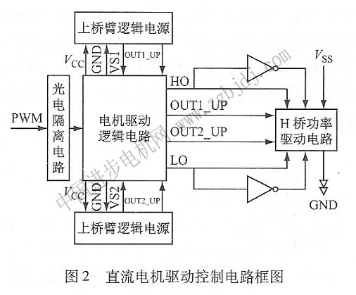 犬功率直流電機(jī)驅(qū)動(dòng)電路分為光電隔離電路、電機(jī)驅(qū)動(dòng)邏輯、上橋臂邏輯電源、H橋功率驅(qū)動(dòng)電路四部分,其功能框圖如圖2所示。