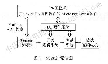 本系統(tǒng)基于P4工控機(jī)的拉制系統(tǒng),運(yùn)用Think&Do控制軟件,通過Profibus-DP協(xié)議與Siemens變頻器進(jìn)行聯(lián)接,將測(cè)試系統(tǒng)和開關(guān)通斷邏輯通過I/O硬件設(shè)備緊密結(jié)合在一起,系統(tǒng)框圖如圖1所示。電機(jī)整個(gè)試驗(yàn)過程控制和通信將通過Ethenet中心提供。通過軟件建立一個(gè)人機(jī)界面( HMI),并設(shè)有屏幕導(dǎo)航。建立數(shù)據(jù)庫記錄保存工具,用于以后的統(tǒng)計(jì)數(shù)據(jù)處理和歸檔,該數(shù)據(jù)庫具有即時(shí)打印功能(SOL基礎(chǔ)庫形式)。系統(tǒng)的建立將會(huì)加強(qiáng)選定試驗(yàn)項(xiàng)目的試驗(yàn)參數(shù)(電壓、電流和頻率等)的閉環(huán)控制,使現(xiàn)有測(cè)量設(shè)備與試驗(yàn)程序一體化,提供準(zhǔn)確、迅速、可靠的信息。