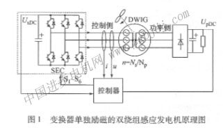 低壓直流電源系統(tǒng)在戰(zhàn)車、飛機(jī)中仍有廣泛應(yīng)用,如現(xiàn)役坦克電源是28 V直流輸出,現(xiàn)役飛機(jī)電源電有一部分是28 V直流輸出,當(dāng)它們輸出18 kW的功率時(shí),直流輸出電流將達(dá)642 A,要采用電力電子變換器直接控制這種低壓大電流的電源系統(tǒng)將會(huì)非常困難。新型的定子雙繞組感應(yīng)發(fā)電機(jī)系統(tǒng)(DWIC)如圖1所示,其定子具有兩套統(tǒng)組,一套為功率繞組,輸出端通常接有整流橋負(fù)載,可以輸出直流電或輸出變頻交流電;另一套為控制繞組,接有靜止的勵(lì)磁變換器( SEC),由變換器提供所需的無功電流,采用一定的控制策略,可以有效地調(diào)節(jié)功率繞組輸出電壓的幅值保持恒定。兩套定子繞組的極數(shù)相同,共用同一個(gè)旋轉(zhuǎn)磁場【1-2】。因此可以利用DWIC定子上具有兩套繞組的特點(diǎn),即在功率繞組中只接有整流橋負(fù)載,輸出低壓大電流的電能,將可控的電力電子變換器放在與功率電路完全隔離的控制繞組回路中,通過改變兩套繞組匝數(shù)比可以把勵(lì)磁回路的電壓等級(jí)適當(dāng)?shù)靥岣,使?lì)磁電流降低,為系統(tǒng)的控制提供了極大的方便,從而實(shí)現(xiàn)了用小電流的勵(lì)磁變換器控制大電流的功率輸出的目的,這是雙繞組感應(yīng)發(fā)電機(jī)的一大優(yōu)點(diǎn)。