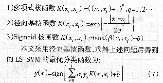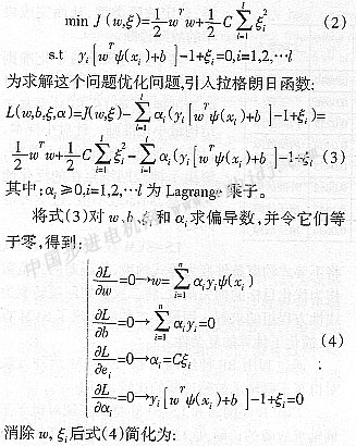 Suykens在文獻[10]中提出了LS-SVM方法,與標準SVM相比,LS-SVM用等式約束代替不等式約束,且將誤差的二范數(shù)作為優(yōu)化目標的損失函數(shù),把標準SVM中解二次規(guī)劃問題轉(zhuǎn)化為求解線性方程組問題[11]: