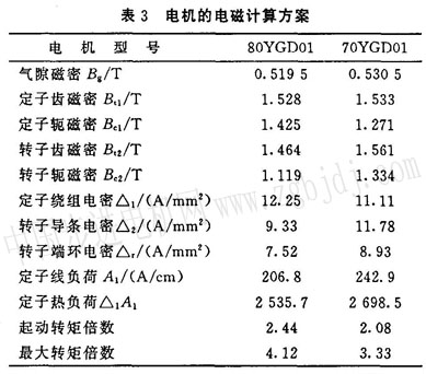 兩個規(guī)格電機的電磁計算方案見表3。表中給出了電機的電、磁負荷及轉(zhuǎn)矩大小。計算表明,對特定電機,其電磁負苘選擇要適當,即電磁負荷的比例要恰當,只有電磁負荷分配均勻了,電機的性能才能達到****。