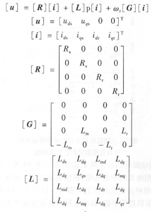 式中:p為微分算子,p= ;ωr為轉子電角速度( rad/s);Rs為定子繞組每相電阻;月,為折算到定子的轉子繞組每相電阻;電感矩陣[L]中的各元素的計算參見文獻【10】。
