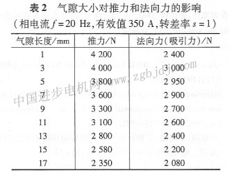 改變氣隙的長度,研究電機的氣隙大小對推力和法向力的影響,仿真結(jié)果如表2所示。