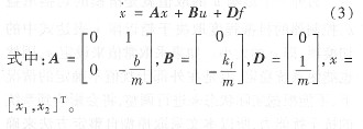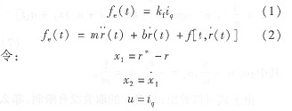 其中:m、b、Kf,分別為直線電動(dòng)機(jī)動(dòng)子質(zhì)量、阻尼系數(shù)和力常數(shù),取值分別是35 kg、0.0l N.s/m、540N/A,fe(t)是電機(jī)推力,r(t)是電機(jī)位移,,f,[t,r(t)]是推力擾動(dòng)。寫成狀態(tài)方程: