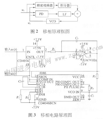 在基本的鎖相環(huán)( PLL)上附加少量的電路就可以獲得非常精確的90度相移,圖3附加了一個精密相乘器與積分器的串接電路,并將它與環(huán)路的鑒相器、環(huán)路濾波器相并聯(lián)。如果輸入信號是對稱的,那么只有在u1和u2嚴格相差90度時,相乘器平均輸出電壓才為零,附加電路對基本PLL沒有影響。只要u1和u2不是嚴格相差90度,相乘器輸出中含有直流成分,積分器對直流信號的增益為無限大,這時附加電路的輸出就成為壓控振蕩器(vco)控制電壓的主要成分,它迫使vco移相,直至u1和u2嚴格相移90度為止。鎖相環(huán)4046輸出信號是方波,很容易利用開關電路完成精密相乘器的作用【3】。由于4046鎖相器中心頻率存在一定范圍,所以必須通過電阻R1、R2、C1(如圖3所示)進行調(diào)節(jié)中心頻率和下限頻率,使其滿足超聲波電動機工作范圍,如圖4、5所示。