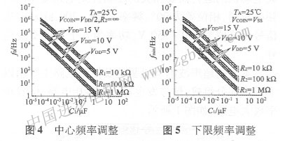 根據(jù)圖4和圖5,選擇不同的C 1、R 1、R 2,可以滿足超聲波電動機工作頻率范圍。鎖相環(huán)4046供電電壓VDD= 15 V,當分別選取C 1=240 pF, R 1=100 kΩ,R 2=1 MΩ,下限頻率大約為20 kHz。當C 1=240 pF;R 1.=1 M,R 2=無窮時,中心 |