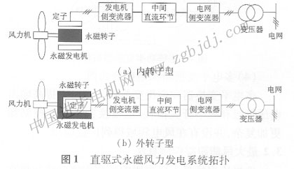 根據(jù)發(fā)電機結(jié)構(gòu)的不同,直驅(qū)式風電系統(tǒng)有內(nèi)轉(zhuǎn)子型和外轉(zhuǎn)子型兩種拓撲:內(nèi)轉(zhuǎn)子型是一種常規(guī)發(fā)電機形式,風力機和永磁體內(nèi)轉(zhuǎn)子同軸安裝:這種結(jié)構(gòu)的發(fā)電機定子繞組和鐵心通風散熱好,溫度低,定子外形尺寸小;外轉(zhuǎn)子型是風力機與發(fā)電機的永磁體外轉(zhuǎn)予直接耦合,定子電樞安裝在靜止軸上。這種結(jié)構(gòu)易于永磁體安裝固定,缺點是對電樞鐵心和繞組通風冷卻不利,永磁體轉(zhuǎn)子直徑大,不易密封防護。