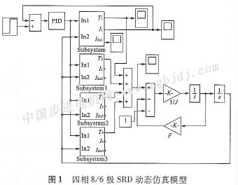 利用sr電動(dòng)機(jī)非線性模型,在matlab/simulink環(huán)境中建立srd動(dòng)態(tài)仿真模型,如圖1所示。sr電動(dòng)機(jī)為四相8/6結(jié)構(gòu),功率變換電路為不對(duì)稱半橋結(jié)構(gòu),模型采用速度和電流雙閉環(huán)控制方式。