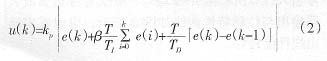 設(shè)定門限為4%,當(dāng)過程控制位移偏差e****值大于4%,系統(tǒng)不引入積分環(huán)節(jié),只有pd控制,當(dāng)過程控制位移偏差e****值小于4%,系統(tǒng)引入積分,進(jìn)行pid控制。軟件算式為:在積分項(xiàng)乘一個權(quán)系數(shù)β,β=1,當(dāng)e****值小于4%;β=o,e****值大于4%。積分分離pid控制算法表達(dá)式為:
