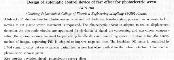 摘要:對塑料縭織布生產(chǎn)線進(jìn)行技術(shù)改造過程中,要求刀具能夠準(zhǔn)確隨動地切割運(yùn)動中的塑料編織布。課題組采用了光電傳感器實(shí)現(xiàn)位移的檢測,應(yīng)用電子線路對偏差信號進(jìn)行預(yù)處理和非線性補(bǔ)償,運(yùn)用微處理器處理偏差數(shù)據(jù)并控制系統(tǒng)動作,應(yīng)用積分分離pid控制方法提高響應(yīng)速度,pwm信號控制無刷直流電動機(jī),進(jìn)行快速伺服調(diào)偏。提出了一種用于在線非接觸檢測的光電伺服、快速調(diào)偏方法。