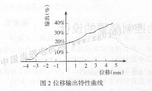 為了在線非接觸檢測調(diào)整運(yùn)行的塑料編織布,采用bh2線性光電傳感器,傳感器內(nèi)部有非線性校正電路和溫度補(bǔ)償環(huán)節(jié),雙臂電橋提高敏感度并調(diào)零。編織布在中間位置時,偏差為零,光通量相等,電橋處于平衡狀態(tài),輸出為零。編織布跑偏時,編織布的位移通過光電傳感器電橋,變成差動電壓信號。經(jīng)過rc濾波、限幅,輸入到運(yùn)放進(jìn)行電壓放大。放大倍數(shù)由r4、r5、r6、c1決定。電壓信號輸入計(jì)算機(jī)模擬an4端口。根據(jù)實(shí)測,運(yùn)算放大器輸冉與位移特性曲線如圖2所示,可以看出輸出線性度較好。