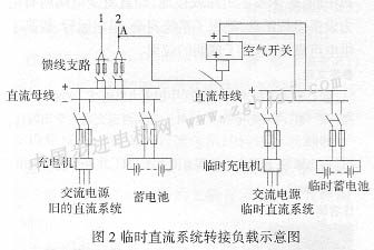 在對現(xiàn)場原有直流系統(tǒng)饋線網(wǎng)絡(luò)進行仔細(xì)核查后,制定了更換方案,總體的更換思路是:搭建一個簡易的臨時直流系統(tǒng),利用臨時系統(tǒng)轉(zhuǎn)接負(fù)載。如圖2所示。