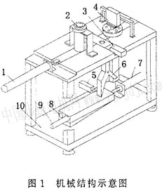 根據(jù)上述工序的要求,設(shè)計(jì)了如圖1所示的機(jī)械裝置,該裝置從工件上料充磁,分檢下料,到磁片和紙片順序疊放,全部實(shí)現(xiàn)了自動(dòng)化。該裝置由以下幾部分組成:1-送片汽缸,2-落襯筒,3-落料汽缸,4-磁頭升降汽缸,5-紙片進(jìn)給汽缸,6-Y型分料斗,7-磁片進(jìn)位汽缸,8-紙片筒,9-成品倉,10-機(jī)架及電磁鐵。下面將結(jié)合工序逐一給予說明。