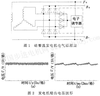 圖1為硅整流發(fā)電機(jī)的電氣原理圖。圖中虛線部分是整體式整流發(fā)電機(jī)的內(nèi)裝電子調(diào)節(jié)器部分。由于該發(fā)電機(jī)由三相同步發(fā)電機(jī)和三相橋式整流器組成,其輸出端B+直流電壓中帶有紋波,圖2所示為實(shí)測(cè)的發(fā)電機(jī)輸出電壓波形,其中圖2b是帶內(nèi)裝電子調(diào)節(jié)器的發(fā)電機(jī)的輸出電壓波形。紋波信號(hào)頻率與發(fā)電機(jī)轉(zhuǎn)速的關(guān)系為: