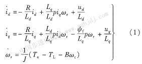 式中:ud、uq為定子電壓d、q軸分量;id、iq為定子電流d、q軸分量;ld、lq為定子電感d、q軸分量;ψf為轉(zhuǎn)子永磁體產(chǎn)生的磁鏈;r為定子電阻;p為極對數(shù);j為轉(zhuǎn)子轉(zhuǎn)動慣量;b為粘性摩擦系數(shù);ωr為轉(zhuǎn)子角速度;te為電磁轉(zhuǎn)矩;t1為負載轉(zhuǎn)矩。