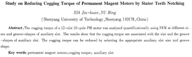 摘要:以一臺(tái)12槽lo極電動(dòng)機(jī)為例,通過有限元法,建立電動(dòng)機(jī)電磁場模型,分析了不同輔助槽槽型和尺寸對水磁電動(dòng)機(jī)定位力矩大小的影響。研究表明,定位力矩的大小與輔助槽的尺寸和槽型有關(guān),選擇合適的輔助槽槽型和尺寸可以有效抑制定位力矩。