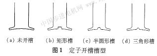 矩形槽、半圓形槽、三角形槽的定子開槽槽形如圖l所示。用三種輔助槽型來分析輔助槽型對定位力矩的影響,未開槽定子齒如圖la所示,定子齒開槽將沿定子齒中心線嚴(yán)格對稱,否則將引入新的諧波。