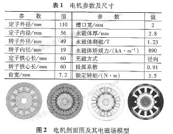 以一臺(tái)12槽10極的永磁電動(dòng)機(jī)為研究對象,對定子輔助槽的尺寸與槽型對定位力矩的影響進(jìn)行分析,電機(jī)參數(shù)如表l所示,電機(jī)剖面尺寸及電磁場場圖如圖2所示。