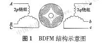 bdfm的結(jié)構(gòu)示意圖如圖1所示。定子上有兩套正弦分布交流繞組,其中一套繞組的極對數(shù)為p,與電網(wǎng)相連接,常稱為功率繞組;另一套繞組的極對數(shù)為g,經(jīng)過取向整流逆變器連接到電網(wǎng),常稱為控制繞組。