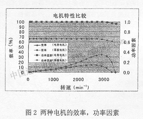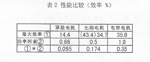 另外crm還具有無(wú)刷電動(dòng)機(jī)和罩極電動(dòng)機(jī)所沒(méi)有的優(yōu)點(diǎn),特別是在電力負(fù)荷和環(huán)境負(fù)荷方面有很大優(yōu)越性(即功率因素×效率、發(fā)電效率指標(biāo)、二氧化碳的產(chǎn)生量少)。圖2和表2是從輸出功率方面對(duì)上述三種電動(dòng)機(jī)的比較結(jié)果。