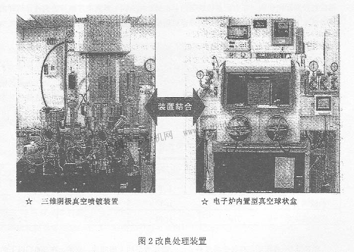 通過對釹鐵硼燒結(jié)磁體預(yù)件的切削、打孔、研削等工序,把它加工成加工精度為±5微米外徑~1. 2mm以及由0.9mm(內(nèi)徑0.3mm,長2.9mm)的圓筒形狀。其次,根據(jù)已有的報道,運用能夠立體成膜的三維陰極真空噴鍍裝置,以數(shù)微米的厚度將dy或者tb金屬均勻地覆蓋子圓筒狀磁體的表面后,再在氧氣和濕度維持在數(shù)ppm以下的ar氣體環(huán)境中,經(jīng)過攝氏70-100度的高溫一定時間內(nèi)熱處理后,使其磁性能得到恢復(fù)。此外,這類處理是在與上述的陰極真空噴鍍裝置相聯(lián)接的帶真空球狀盒的氣體循環(huán)精密儀器的ar氣體環(huán)境下進(jìn)行的。另外,在熱處理后還要繼續(xù)在攝氏60度下對其進(jìn)行數(shù)十分鐘的熱處理。