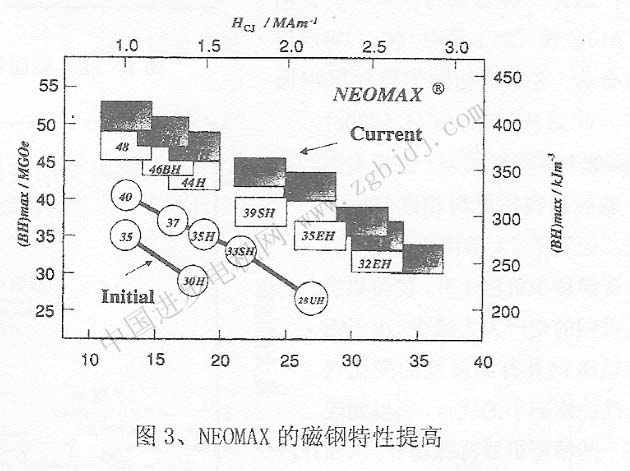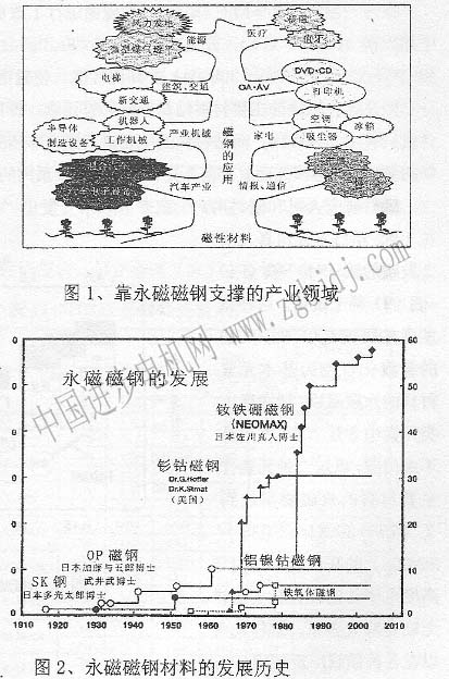 隨著社會(huì)發(fā)展步入高度電氣化,對(duì)磁性材料的需求量也越來(lái)越大。圖l是靠永磁材料支撐的產(chǎn)業(yè)領(lǐng)域。圖2是永磁材料的發(fā)展歷史。最早是1917年日本東北帝國(guó)大學(xué)的多光太郎博士發(fā)明的ks鋼,在1940年初上市;這是一種以鐵為基本材料含鋁(al)、鎳(ni)和鈷(co)等成份的合金,這是最初的鋁鎳鈷磁鋼原型。此后從36kj/m3(4.5mgoe)到80kj/m3(l0mgoe)的許多高性能的鋁鎳鈷材料相繼開(kāi)發(fā)出來(lái),但到了70年代后期由于鈷的資源稀少價(jià)格上升,使得鋁鎳鈷磁鋼的生產(chǎn)大大減少。由于鋁鎳鈷磁鋼具有隨溫度的變化對(duì)磁性能影響小的優(yōu)點(diǎn),所以到現(xiàn)在一些精密機(jī)器特殊場(chǎng)合,例如計(jì)測(cè)儀表等仍然采用鋁鎳鈷磁鋼。
