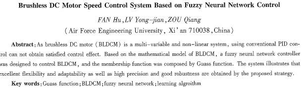 摘要:無刷直流電動(dòng)機(jī)是一種多變量、非線陛的控制系統(tǒng),采用經(jīng)典的pid控制難以得到滿意的控制效果。在分析無刷直流電動(dòng)機(jī)數(shù)學(xué)模型基礎(chǔ)上,提出了一種把高斯基函數(shù)作為隸屬麗數(shù)設(shè)計(jì)無刷直流電動(dòng)機(jī)模糊神經(jīng)網(wǎng)絡(luò)控制器的新方法。仿真表明,系統(tǒng)響應(yīng)速度快,抗干擾能力強(qiáng),具有較高的控制精度和較好的魯棒性: