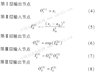 第3層對(duì)應(yīng)模糊推理這里用x乘積操作代替模糊操作;第5層對(duì)應(yīng)去模糊化操作.網(wǎng)絡(luò)的輸入輸出關(guān)系如下: