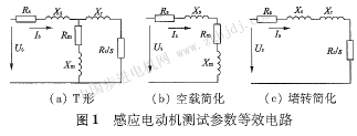 傳統(tǒng)的感應(yīng)電動機穩(wěn)態(tài)模型t形等效電路參數(shù)測試方法是通過直流試驗、空載試驗和堵轉(zhuǎn)試驗[1]得到。感應(yīng)電動機空載試驗通過測量空載特性以確定電機機械損耗、鐵損耗及勵磁阻抗,在空載運行條件下,電機定子繞組接頻率為額定值的三相對稱電壓,電機不帶任何機械負載,以接近于同步速的轉(zhuǎn)速空轉(zhuǎn),這時轉(zhuǎn)子電流和轉(zhuǎn)子銅耗都很小,扣除機械損耗之后可認為轉(zhuǎn)子支路開路。感應(yīng)電動機堵轉(zhuǎn)試驗(又稱短路試驗)通過測量堵轉(zhuǎn)特性以確定短路阻抗,在堵轉(zhuǎn)運行條件下,電機定子繞組仍接頻率為額定值的三相對稱電壓,但電機在外力作用下停止轉(zhuǎn)動,這時勵磁支路的阻抗相對轉(zhuǎn)子支路大得多,使轉(zhuǎn)子電流和轉(zhuǎn)子銅耗很大,而鐵損耗很低,故可認為勵磁支路開路。t形等效電路在空載和堵轉(zhuǎn)兩種特殊工作條件下可以得到簡化,如圖1所示。
