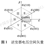 對(duì)于一臺(tái)三相兩點(diǎn)式電壓型逆變器,一般由三組、六個(gè)開(kāi)關(guān)組成8個(gè)開(kāi)關(guān)狀態(tài)(s a,s b,s c,s a,s b,s c),并可以形成如圖1所示的8個(gè)電壓空間矢量。