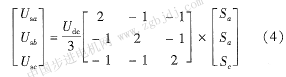 當(dāng)開(kāi)關(guān)狀態(tài)為“1”時(shí),對(duì)應(yīng)相的開(kāi)關(guān)狀態(tài)導(dǎo)通,當(dāng)開(kāi)關(guān)狀態(tài)為“0”時(shí),對(duì)應(yīng)相的開(kāi)關(guān)狀態(tài)斷開(kāi)。如果逆變器的輸入電壓為udc,則其輸出的三相電壓為