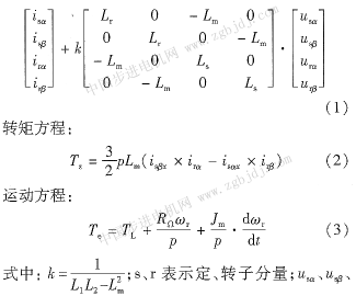 式中:k=1/l1l2-l2m;s,r表示定、轉(zhuǎn)子分量,nsa、usbura,urb分別為定、轉(zhuǎn)子在α,β軸上的電壓分量,α,β表示兩相靜止坐標(biāo)系的坐標(biāo)軸;isb,isa,ira,irb分別為定、轉(zhuǎn)子在α,β軸上的電流分量;rs、rr分別為定、轉(zhuǎn)子電阻;ls、lr分別為定、轉(zhuǎn)子電感;lm為定、轉(zhuǎn)子繞組間互感;ωr為轉(zhuǎn)子電角速度;p為極對(duì)數(shù);jm為轉(zhuǎn)動(dòng)慣量;tl為負(fù)載轉(zhuǎn)矩;rω為電機(jī)阻尼系數(shù)。