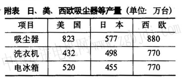 1983年世界幾種主要家電產品的產量為:洗衣機2957萬臺,電冰箱3857萬臺,空調器2500萬臺,吸塵器3190萬臺。可見吸塵器是一種量大面廣的產品,尤其是日、美、西歐國家的吸塵器產量非常驚人,1983年洗衣機,電冰箱與吸塵器產量如附表所示: