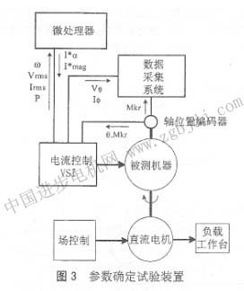 特殊結(jié)構(gòu)的7. 5kva電流控制型電壓源逆變器驅(qū)動(dòng)系統(tǒng)是用來(lái)給被測(cè)電機(jī)提供低諧波正弦電流。用戶接口采用微處理器,并且允許相電流矢量人工控制或自動(dòng)控制。圖3展示的是實(shí)驗(yàn)裝置的基本模塊圖。