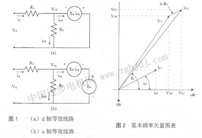d軸和q軸等效電路實(shí)時(shí)測(cè)量能夠根據(jù)機(jī)構(gòu)基本原理相位圖表確定。無(wú)刷永磁同步機(jī)構(gòu)在接近額定負(fù)載工作情況如圖2所述。相電流/s,是口軸的分支,因此產(chǎn)生1個(gè)d軸的電流分支。通常,運(yùn)行模式牽涉到“磁通減少”,導(dǎo)致式(1)中磁阻轉(zhuǎn)矩分量加到由wmagiq產(chǎn)生的場(chǎng)調(diào)整轉(zhuǎn)矩,所有圖2中的相由基頻元件構(gòu)成的,并來(lái)自于可測(cè)量的輸入量,一旦測(cè)得,這些相的d軸和口軸昀組件可以被用來(lái)計(jì)算圖l中等效電路的參數(shù)計(jì)算。