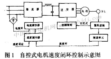 從外部控制系統(tǒng)的組成看,這兩種電系統(tǒng)都包括如下三個(gè)部分,變流器、轉(zhuǎn)子置檢測(cè)器和控制單元。由于兩種電機(jī)系統(tǒng)采用自控式運(yùn)行方式,因此控制單元完成控制功能極為相似,一般為三個(gè)方面?貑卧獙(duì)轉(zhuǎn)子位置信號(hào)進(jìn)行處理、完成濾酒消除干擾和速度測(cè)定等;控制單元根據(jù)有:的轉(zhuǎn)子位置信號(hào)和電機(jī)的運(yùn)行要求,完成.變器脈沖分配和觸發(fā)延時(shí)等,以實(shí)現(xiàn)對(duì)電:電流的相位控制;控制單元通過(guò)速度調(diào)節(jié),(有時(shí)也需電流調(diào)節(jié)器)完成對(duì)整流器的:發(fā)角控制,構(gòu)成一個(gè)速度閉環(huán)調(diào)壓調(diào)速系和保護(hù)等電路,硬件各部分承擔(dān)的功能簡(jiǎn)統(tǒng)。圖1是自控式電機(jī)速度閉環(huán)控制的基本 述如下框圖。