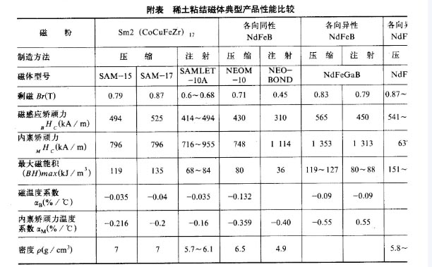 b.注射成型粘結磁體,粘結劑使用龍12樹脂,其特點是吸潮性小,與被粘物結合穩(wěn)定,磁體尺寸誤差可控制在公差圍內(nèi)。為了獲得高溫穩(wěn)定性的樹脂,日本在研究pps、lcp(液晶聚合物)、聚丁稀對苯二酸脂等粘結劑,目前,在研制使用這些樹脂的注射成型粘結磁此外,還有擠壓成型,在英國已有實例。結磁體的性能如附表所示。
