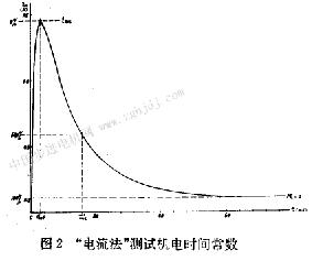 在電動(dòng)機(jī)的電樞回路中串入合適的采樣電阻r(也可用量程合適的電流表內(nèi)阻代替),采樣電阻對(duì)電樞回路電阻的影響應(yīng)盡量小。試驗(yàn)時(shí)電動(dòng)機(jī)空載,先加以額定勵(lì)磁電壓,然后將額定電樞電壓階躍式加入串有采樣電阻的電樞回路兩端,用示波器攝取采樣電阻兩端電壓降(正比于電樞電流)隨轉(zhuǎn)速變化的波形,從波形圖上求取對(duì)應(yīng)電樞轉(zhuǎn)速?gòu)牧慵铀俚椒(wěn)定空載轉(zhuǎn)速的63.2 所需的時(shí)間。典型的測(cè)試曲線如圖2所示。