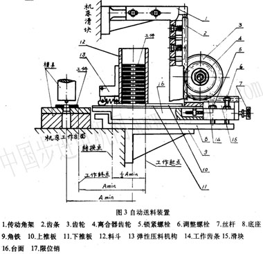 工作齒條與滑塊連為一體,滑塊與推板面可調(diào)性連接。當滑塊作進給運動時,上推扳將料斗內(nèi)的工件(其中一件)推出1/2amin距離,并在彈性壓料機構(gòu)的作用下,使工件進入轉(zhuǎn)換點(處)。然后在滑塊作第二次進給運動時,下推板將在轉(zhuǎn)換點 (處)的工件推入模具中心,而上推板再次把工件推入轉(zhuǎn)換點 |