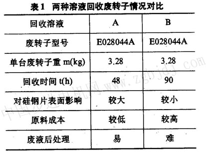 根據(jù)廢轉(zhuǎn)子組成材料的特點(diǎn),對(duì)兩種回收處理溶液進(jìn)行了選擇對(duì)比,結(jié)果如表