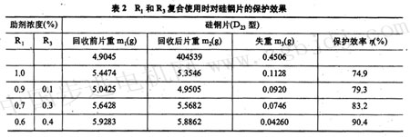 根據(jù)有關(guān)資料介紹以及A溶液對(duì)硅鋼片表面性能影響的特點(diǎn),進(jìn)行了回收液用助劑篩選和復(fù)配,結(jié)果如表2所示。