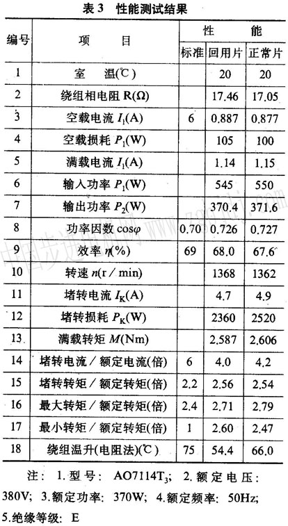 回收的硅鋼片重新壓鑄后,經(jīng)江蘇省微電機(jī)測(cè)試站按JBl009—77對(duì)比測(cè)試,所測(cè)性能符合要求(見(jiàn)表3)。