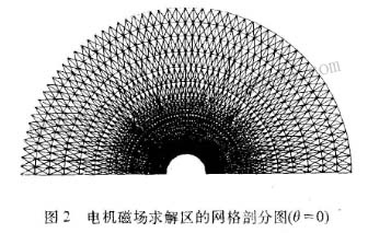設定轉子齒中心線對齊時θ=0,根據電機的結構、+通電方式和磁場對稱性,可選定半個電機的空間作為電機磁場的求解區(qū)域,圖2示出這時求解區(qū)的網格剖分。