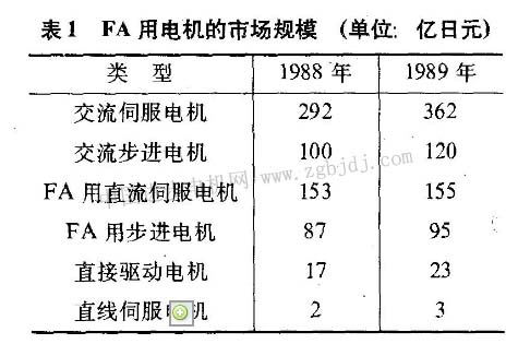 fa(factory automation)用電機(jī)即工廠自動(dòng)化用的電機(jī)在日本市場(chǎng)上主要以伺服電機(jī)為主,其中包括交流伺服電機(jī)(無(wú)刷伺服電機(jī))、直流伺服電機(jī)、直接驅(qū)動(dòng)電機(jī)、直線伺服電機(jī)及混合型步進(jìn)電動(dòng)機(jī)等。表1示出日本近年來(lái)以伺服電機(jī)為中心,用于速度控制和位置控制fa用電機(jī)的市場(chǎng)規(guī)模。其中交流伺服電機(jī)的市場(chǎng)很大,1989年自產(chǎn)及進(jìn)出口額達(dá)到362億日元。