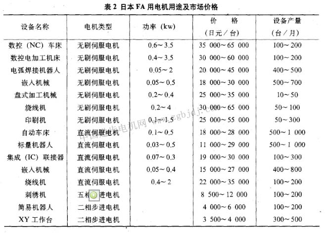 fa用電機(jī)用途及日本市場(chǎng)價(jià)格如表2所示。