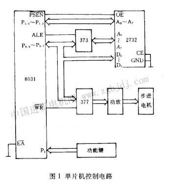 圖l所示電路以8031單片機為核心,外擴程序存儲器2732、地址鎖存器74LS377、輸出控制鎖存器74LS377及功能鍵等。單片機輸出控制字由Po口數(shù)據(jù)總絨經(jīng)過鎖存器74LS377輸給步進電動機的功放電路,8031的P1口設(shè)置為位控方式,通過各功能鍵輸入控制指令實現(xiàn)對步進電動機的開環(huán)控制,P.口各引腳功能為: