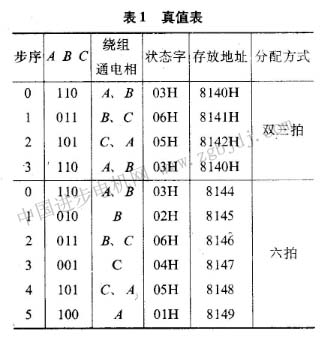 用微機軟件實現(xiàn)環(huán)形分配器功能的方法比較多,如查表法、循環(huán)移位法、判斷法等,本設(shè)計采用查表法,對于三相反應式步進電動機,當A、B、C三相繞組的功放電路經(jīng)鎖存器分別接到Po口的P0.0、P0.1、P0.2時,要使電機的A、B兩相繞組通電,P0口的狀態(tài)應為0.3H,使B、C兩相繞組通電,P0口的狀態(tài)應為0.6H。因此實現(xiàn)三相雙三拍及三相六拍分配方式的真值表如表l所示。